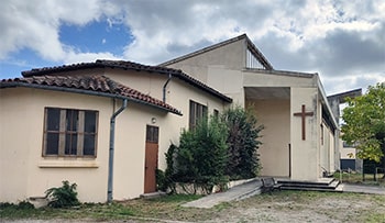 Take Metro line B (connects with line A at station Jean Jaurès) to Barrière de Paris. Take the middle exit 'Sortie vers Avenue des Etats-Unis'. At the top of the stairs head up the road on your right (Avenue des Etats-Unis) past Midas. Continue past Rue Pierre Rubens to the second road on your left, Rue Ste-Mélanie. Walk down here and take the first right into Rue Clausade. The church is on your right.